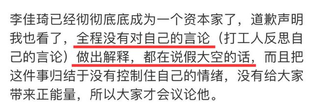 李佳琦说了两遍对不起,但仔细读两遍就会觉得很官方,甚至避重就轻,他根本就没意识到问题所在,道歉是因为自己没控制好情绪,说了不当言论,也只是向评论区里的那位女生道歉,至于其他的李佳琦恐怕都不知道哪里有错,提都没提一句(打工人反思自己的言论)。