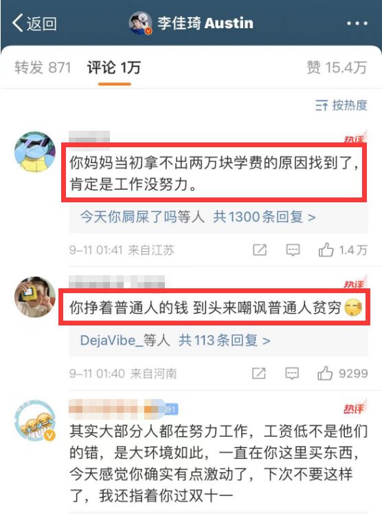 当下李佳琦的评论区已沦陷,大多都是对他道歉不买账的留言,有网友甚至拿他妈妈当初拿不出两万块学费一事回怼他,说他妈妈肯定是工作没努力,还有网友说李佳琦挣着普通人的钱,到头来却嘲讽普通人贫穷。