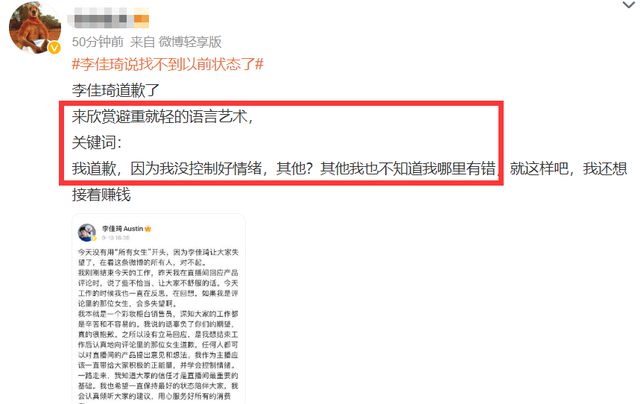 还有两个月就到双十一了,即便李佳琦再有钱,恐怕也不会嫌钱多,所以迫于舆论压力才站出来道歉?还是为了钱才低头道歉?如果不上热搜,李佳琦还会回应吗?