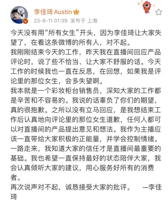 9月11日凌晨,李佳琦就言论不当发文道歉,他表示之所以没有第一时间站出来回应,是一直在工作,想结束工作后认真向评论区里的那位女生道歉,也让大家失望了,对不起。
