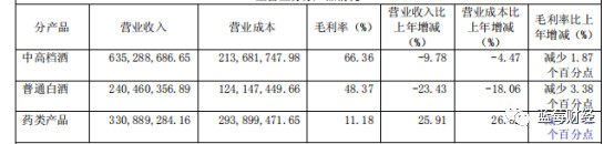 报告显示,中高档酒占了营收的一半左右,且毛利率最高66%,但是营业收入却比去年减少10%,但是金种子酒在药类产品的营收却增长了26%,可惜的是其毛利率仅为11%,这也就导致了总营收的增长才2%不到。