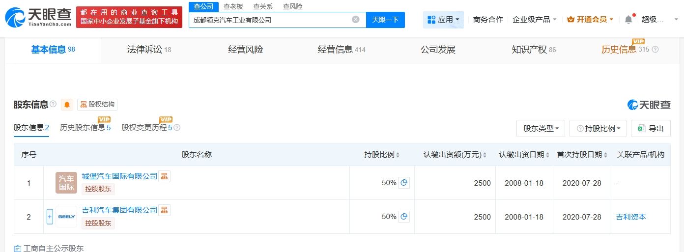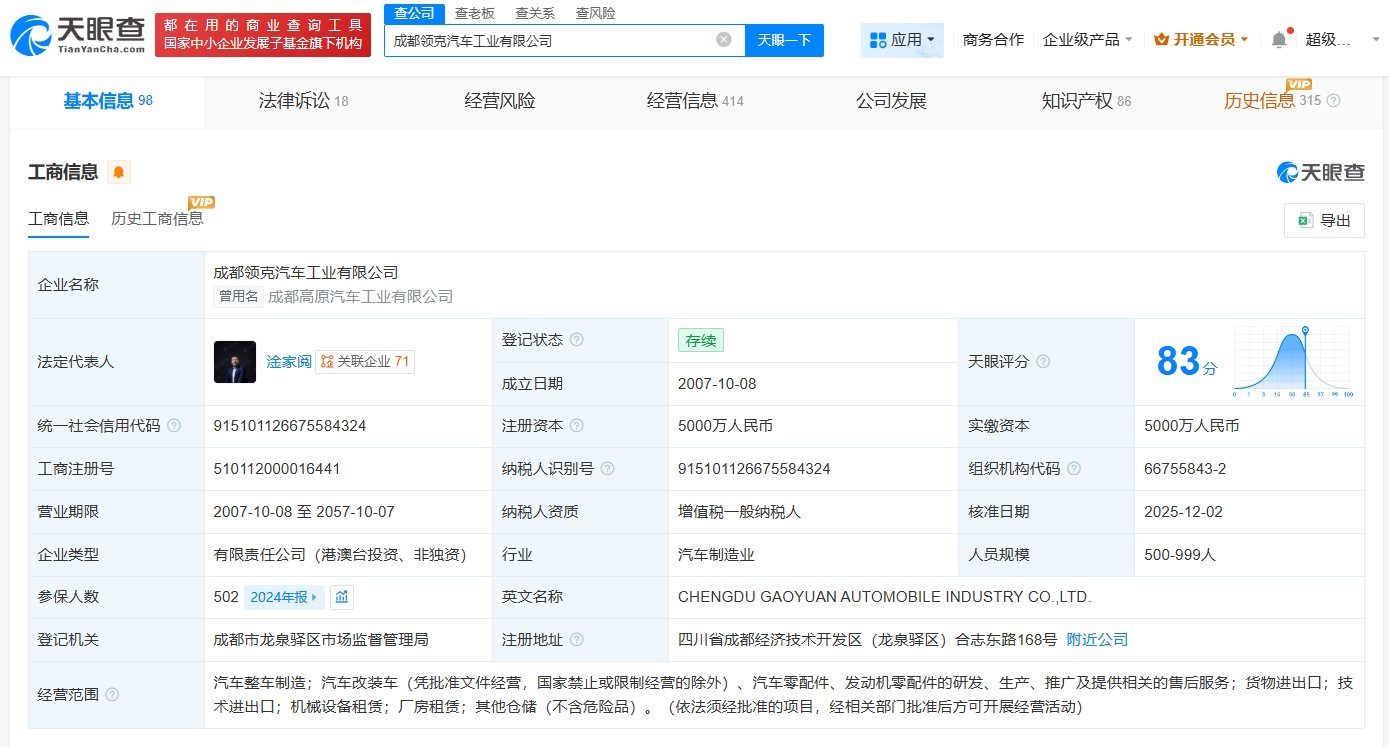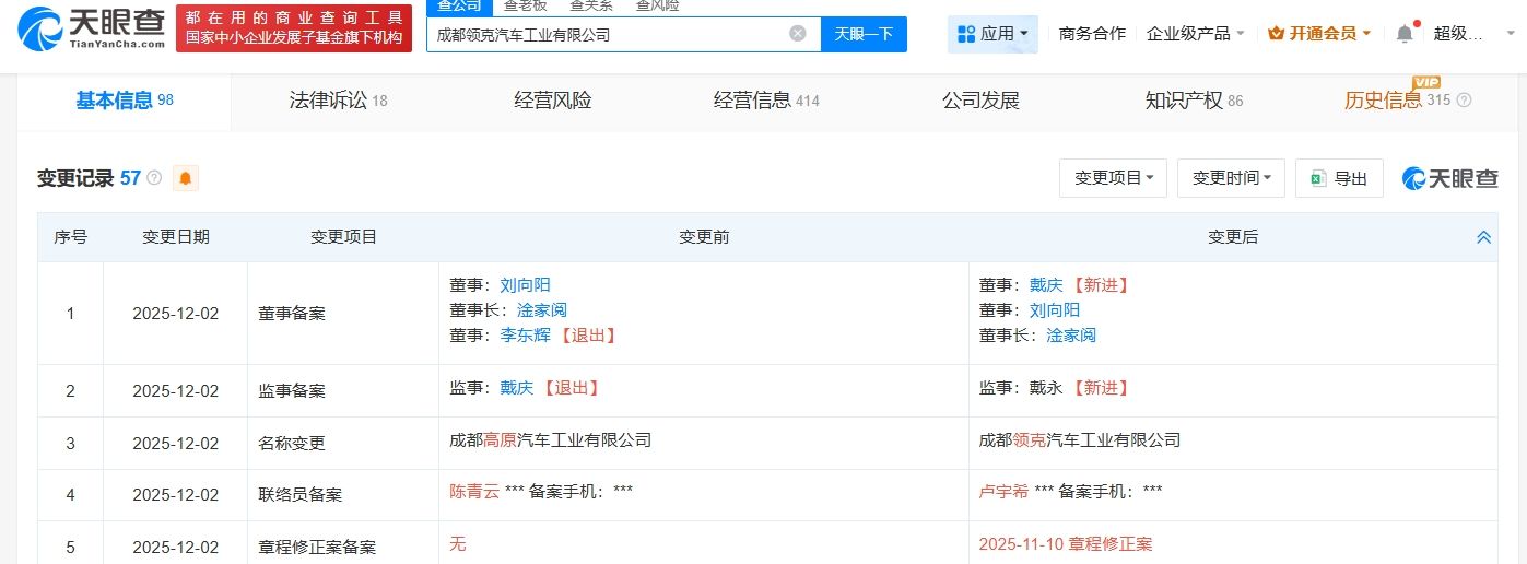 天眼查App显示,近日,成都高原汽车工业有限公司发生工商变更,企业名称变更为成都领克汽车工业有限公司,同时部分高管发生变更。