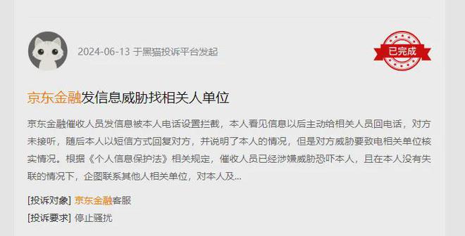 “京东金融催收人员发信息被本人电话设置拦截,本人看见信息以后主动给相关人员回电话,对方未接听,随后本人以短信方式回复对方,并说明了本人的情况,但是对方威胁要致电相关单位核实情况。根据《个人信息保护法》相关规定,催收人员已经涉嫌威胁恐吓本人,且在本人没有失联的情况下,企图联系其他人相关单位,对本人及家人造成严重影响。”另有用户同时投诉称。