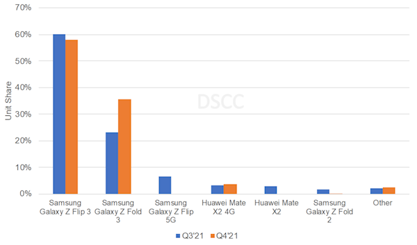 机型方面,最后欢迎的折叠屏手机是采用翻盖折叠方案的Galaxy Z Flip 3,其次是Galaxy Z Fold 3、Galaxy Z Flip 5G,华为Mate X2 4G版和5G版则排在四五位。
