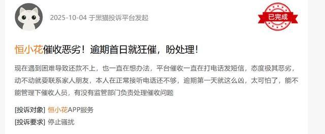“恒小花”的催收方式也频频被投诉。据黑猫投诉平台显示,不少用户投诉其“信息骚扰和恐吓”“爆通讯录”等各种不合理的催收行为。一用户表示因遇困难导致还款逾期一天,频繁接到态度恶劣的催收电话和短信,甚至有用户称在还款日当天就受到“暴力催收”。