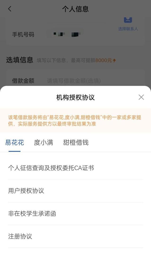 表面上看用户只需要签署5个协议,但点进协议中还有附属内容,包括将个人隐私信息授权给第三方的协议。比如在《机构授权协议》中包括“易花花”4项协议、“度小满”8项协议、“甜橙借钱”21项协议,合计共33项。其中并不只是这三个平台的相关协议,还包括其他机构平台的相关协议。