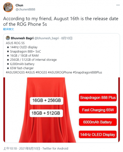 据海外爆料达人@Bhuvnesh Bagri 以及 @Chun最新发布的信息显示,全新的升级版机型将被命名为 ROG Phone 5S(ROG游戏手机5S),其将继续配备144Hz OLED屏,支持300Hz原生触控采样率,支持动态调整屏幕刷新率,进一步优化了全链路触控反应。