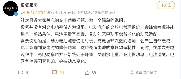 【TechWeb】5月13日消息,近日有网友反馈极氪汽车的充电功率会限制,极氪汽车官方今日发文进行了说明。极氪汽车表示,并没有对充电功率做人为设限。