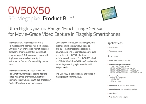 超广角镜头:5000万像素的OV50M或S5KJN5传感器