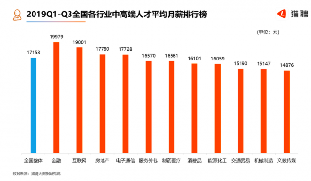 在全国中高端人才平均月薪排名最高的前20城市中,2019年一季度到三季度全国全行业应届生的平均起薪为7566元/月,智慧医疗、物联网、机器人中高端人才平均月薪为21951元、18047元、17602元。