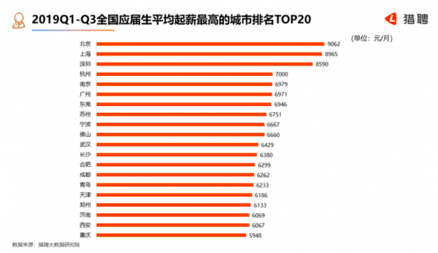 2019年前三季度,北京应届生平均起薪为9062元/月,突破9000,位居第一;上海为8965元/月,接近9000,比北京低97元。深圳以8590元/月的起薪位居第三。杭州、南京排名第四、第五,起薪为7000元/月、6979元/月;广州位居第六,平均起薪为6971元。