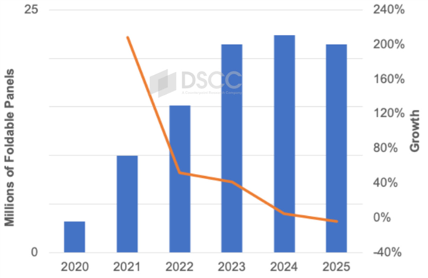 DSCC报告指出,从2019年到2023年,折叠屏面板出货量每年至少增加40%,但2024年预计仅增长4%,2025年将下降4%,出货量稳定在2200万块左右。