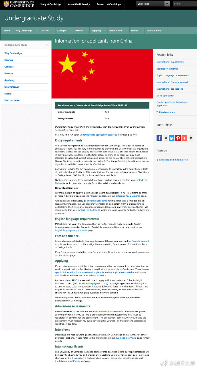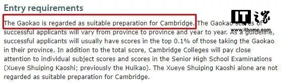 IT之家此前报道过,剑桥大学网页在“入学要求”里明确指出:中国高考是剑桥大学认可的考试。高考分数达标的考生(也就是本省的top 0.1%),就可以考虑填报剑桥大学。
