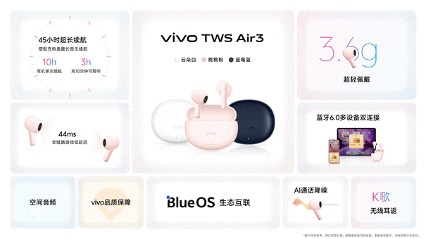 vivo TWS Air3现已开售,上市价格99元,单耳机仅重3.6g,支持IP54防尘抗水、至长45小时听歌续航(配合耳机盒)、44ms全链路游戏低时延和蓝牙6.0多设备双连接,融入BlueOS生态,是vivo生态的极佳拍档。