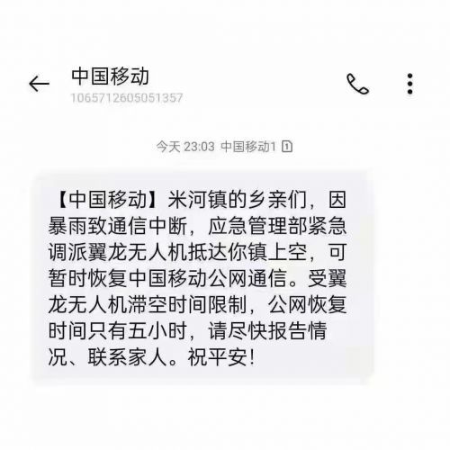 中国移动翼龙大型长航时无人机应急通信系统保障河南灾区通信快报