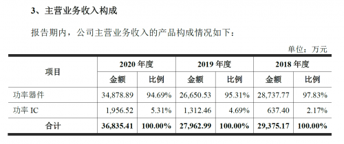 其主营业务可以分为两类,功率器件和功率IC。在2020年功率器件收入为34,878.89万元,占比为94.69%。功率IC收入为1,956.52万元,占比为5.31%。