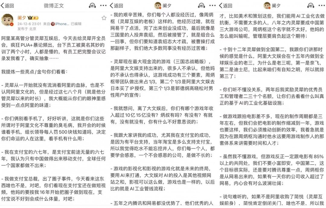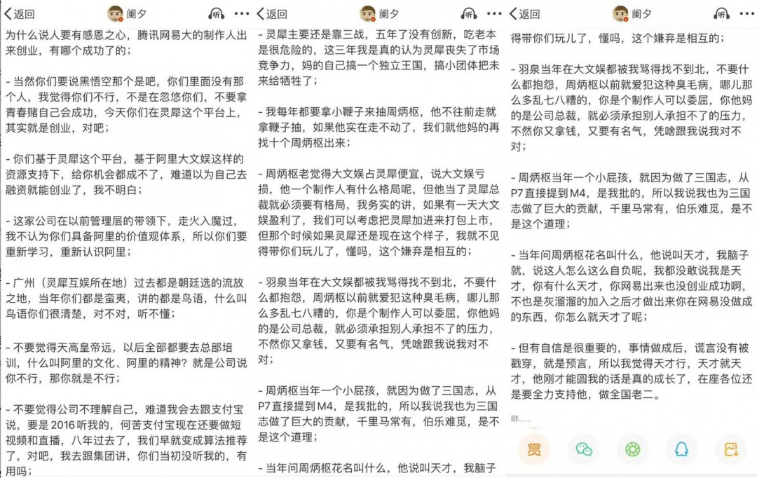 阿里某高管分管灵犀互娱后,今天去给灵犀开全员会,疯狂PUA+暴论频出,台下员工被莫名其妙的训了两个小时,人都是懵的,有员工把完整会议记录发我看了,确实抽象……