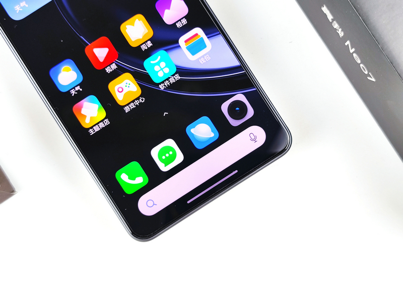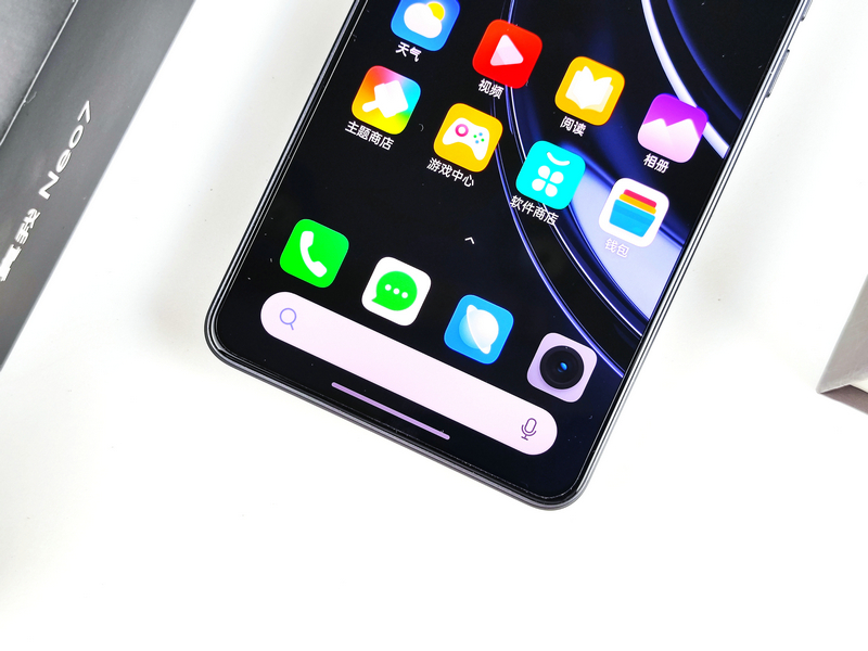 机身正面,全新的真我Neo7采用了一块6.78英寸的护眼电竞直屏,直屏的特性可以让我们在游戏中避免了误触的发生,同时还具备了柔边的好手感。而且边框极窄,提供极致的视觉享受。