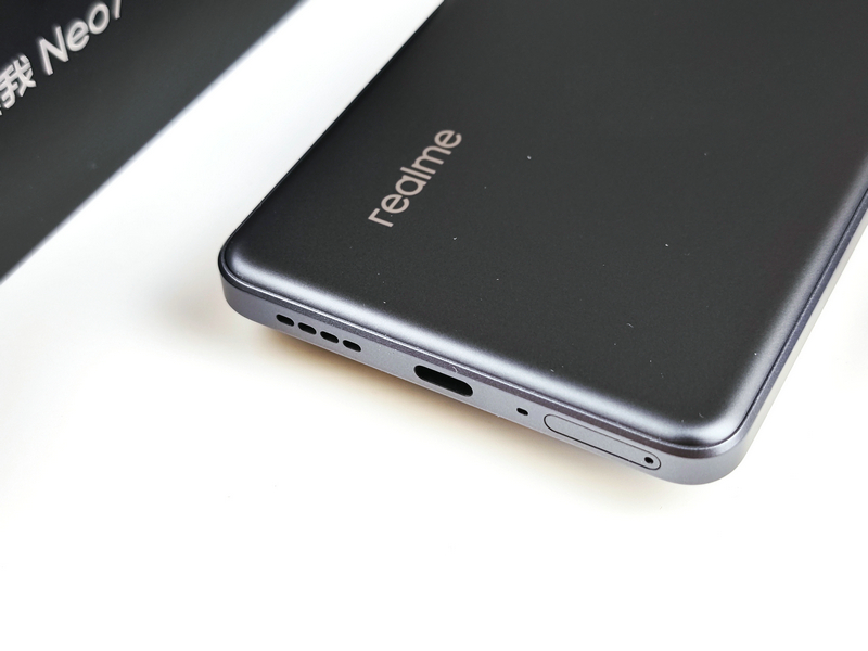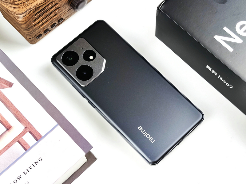 机身背部,真我Neo7此次共带来了简约高级的星舰版、沉稳神秘的陨石黑和惊艳夺目的潜航共三款配色,笔者拿到的是经典的陨石黑配色版本,通体采用了哑光磨砂质感,手感顺滑细腻。配合带有亮色倒角线装饰的相机Deco,深邃而不沉闷。