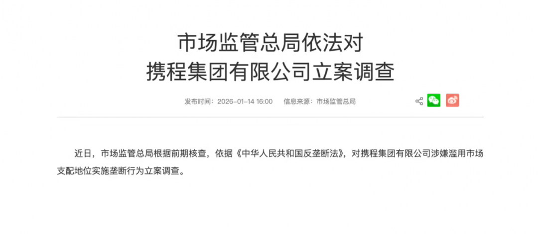 【TechWeb】1月14日消息,据国家市场监督管理总局消息,近日,市场监管总局根据前期核查,依据《中华人民共和国反垄断法》,对携程集团有限公司涉嫌滥用市场支配地位实施垄断行为立案调查。