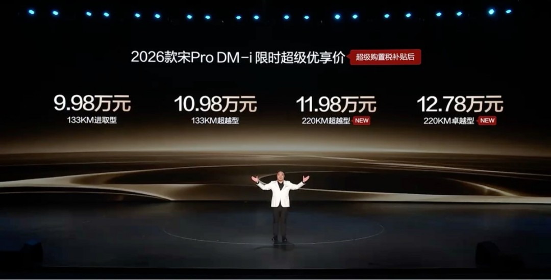 【TechWeb】1月10日消息,2026款比亚迪宋Pro DM-i长续航版正式上市,全系限时超级优享价9.98-12.78万元,其中220km版本限时起售价为11.98 万元。