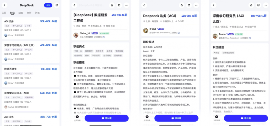 DeepSeek也更加关注AI产品的大局观和人文关怀,DeepSeek及其母公司幻方量化在脉脉高聘发布深度学习研究员、硬件技术工程师等多个技术岗位和AGI法务、采购经理、高级运维开发工程师等非技术类岗位,大模型人才供需比为1.76。
