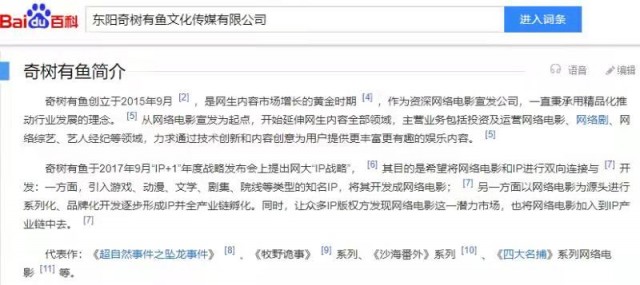 企查查信息显示,该公司成立于2015年,法定代表人为董冠杰,经营范围包含:影视文化信息咨询;影视剧本创作、策划、交易;艺人经纪;影视制作技术指导服务;企业形象策划等。公开资料显示,奇树有鱼是一家网络电影宣发公司,其代表作含《牧野诡事》系列、《沙海番外》系列等。