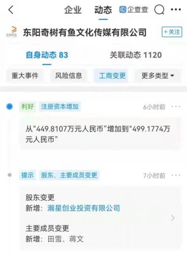 【TechWeb】企查查APP显示,近日,东阳奇树有鱼文化传媒有限公司发生工商变更,新增小米关联公司瀚星创业投资有限公司为股东,同时公司注册资本由449.81万元人民币增加至499.18万元人民币。