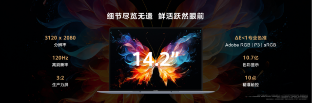 华为MateBook X Pro是全球首款14.2英寸柔性OLED常规形态笔记本,14.2英寸的柔性OLED屏幕拥有93%的超高屏占比,分辨率3120 x 2080,PPI高达264,显示细腻没有颗粒感。色彩表现上,支持原生10.7亿色的色彩显示,在Adobe RGB、sRGB、P3三色域下均有∆E<1专业级色准表现,色彩精准还原。全屏亮度高达600尼特,显示HDR内容下1000尼特的峰值亮度。自研OLED显示增强算法以及出厂逐台校色的严苛标准带来了更真实、更清晰、更流畅的显示效果以及更舒适、更可靠的使用体验。