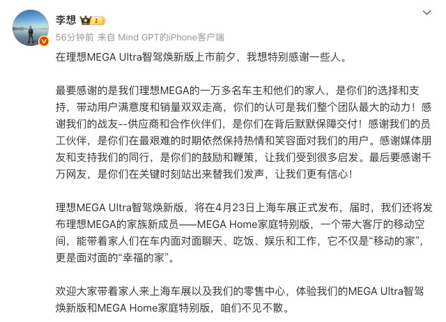 李想表示,理想MEGA Ultra智驾焕新版将在4月23日上海车展正式发布,届时还将发布理想MEGA的家族新成员——MEGA Home家庭特别版。