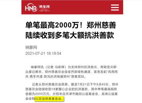 比亚迪慈善基金会向郑州慈善总会捐款2000万元