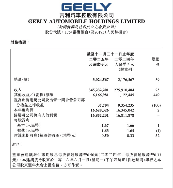 吉利汽车发布2025年度财报。集团全年销量突破302万辆,创下历史新高。营业收入达到3452亿元。收入同比增长25%。归属母公司股东的净利润为168.5亿元。每股基本盈利1.67元。