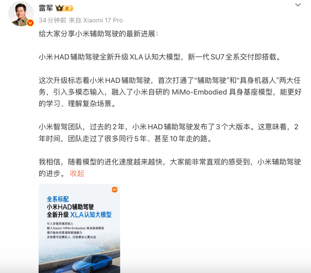 今日上午,小米创始人雷军在微博分享小米辅助驾驶的最新进展。他表示,小米HAD辅助驾驶全新升级XLA认知大模型,新一代SU7全系交付即搭载。