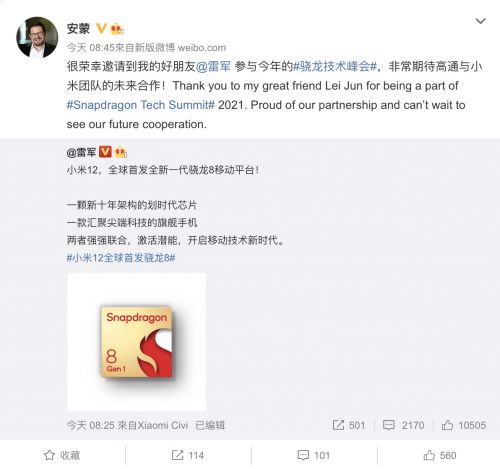 这也说明小米12全球首发获得了高通官方认证,小米此次调教骁龙 8 Gen 1更注重未来提升用户的综合使用体验,此次雷军宣布小米全球首发骁龙 8 Gen 1。