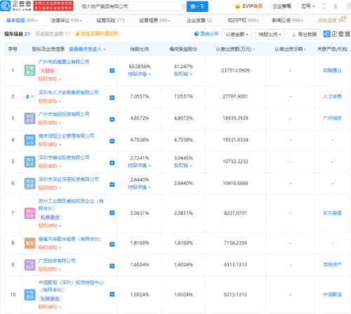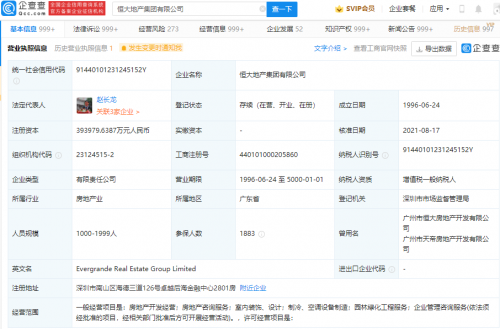 企查查信息显示,该公司成立于1996年,注册资本39.4亿元人民币,经营范围包含:房地产开发经营;房地产咨询服务;室内装饰、设计等,其大股东为广州市凯隆置业有限公司,持股60.29%。