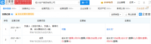 【TechWeb】企查查APP显示,8月17日,恒大地产集团有限公司发生工商变更,许家印卸任董事长职务,由赵长龙接任,同时法定代表人由柯鹏变更为赵长龙。