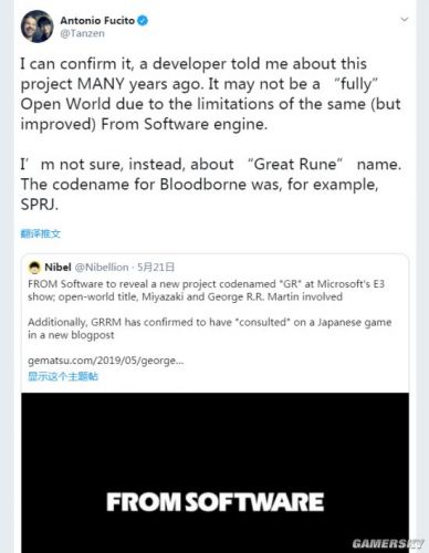 另外他还补充说,“Great Rune”可能只是个代号,他举例说:例如《血源诅咒》的代号就是SPRJ。换句话说,这款游戏的最终定名也有可能并不是“Great Rune”。