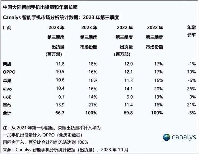 只是荣耀的高增速并没有保持很长时间,从2022年三季度开始,出货量持续下跌,到了今年第一季度,荣耀的市场份额降至16%,排名也来到了第四,Canalys数据称,荣耀一季度市场份额同比下滑高达35%。