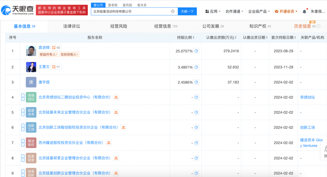 北京硅基流动科技有限公司成立于2023年8月,法定代表人为袁进辉。股东信息显示,该公司现由袁进辉、王慧文、唐宇煜、北京奇绩创坛二期创业投资中心(有限合伙)及上述新增股东等共同持股。
