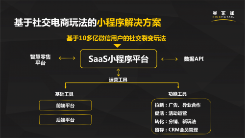 星家加的小程序全部在SaaS平台上部署,并与智能化大数据和智慧零售系统打通,进行全面的赋能。同时星家加还做了很多引流的运营工具,包括前端平台和后端平台的基础工具,以及各种功能性工具。利用异业合作和活动运营的手段,星家加可以帮助企业实现快速拉新和促活,同时利用分销和CRM系统去提高转化率和留存率。