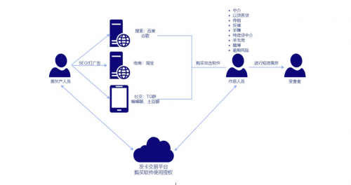 相关数据显示,短信轰炸黑产目前危害涉及超2000个网站的3500多个验证码接口和2400短信接口,每天全网发生的轰炸短信多达160万+次。从非法软件的开发,交由运营人员进行渠道售卖,或通过多层级的代理下线发展有短信轰炸需求的人员,为其提供短信轰炸服务,短信轰炸俨然已经形成了一套完整的产业链,加之不少开发和运营者,通过软件打包部署在云端服务器的方式,极大的降低了终端人员的使用门槛和成本,更是促成了产业链的迅速扩大。