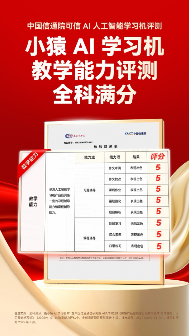 通过该测试的小猿AI学习机于2025年4月面世,搭载自研猿力大模型,为孩子提供AI全流程辅助学习方案,涵盖每日学习计划、学情诊断、知识图谱、课程学习、每日一练等,带来新一代个性化学习体验。该产品是业内首次实现类机器人双形态,可以为孩子提供全方位学习陪伴;其精准学系统,打造「诊-学-练」智能化闭环;五重错因定位,真正实现类真人老师1对1个性化讲题。