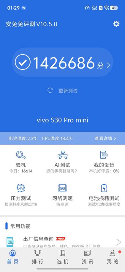 为了保证高性能的持续稳定输出,vivo S30 Pro mini配备了冰原散热系统。整机散热面积达到26800mm²,其中广域VC均热板面积为3570mm²。在高强度游戏或长时间使用过程中,散热系统能够迅速将热量均匀分散,有效降低手机核心部件的温度。经过实际测试,在连续玩《王者荣耀》一小时后,手机背面温度仅略有上升,仍能保持在一个较为舒适的触感范围内,确保手机性能不受高温影响,持续稳定发挥,让用户尽情享受畅快的使用体验。