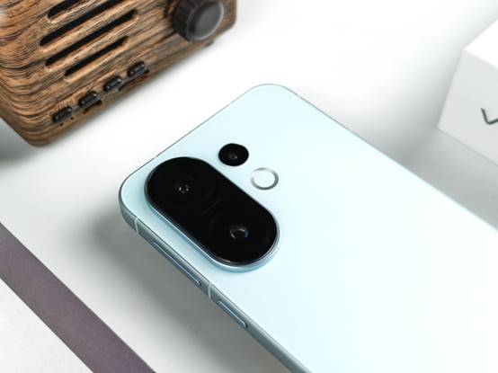 背部上方,该机的后置相机模组采用了双层金属镜圈设计,上层金属镜圈包裹玻璃镜片,下层金属镜圈搭配高亮钻石切边,不仅在视觉上减轻了模组的厚重感,更增添了精致感与高级感。同时,镜组的玻璃被金属包裹,在平放桌面时能有效防止划伤,延长相机的使用寿命,体现了vivo对产品细节的用心打磨。此外,模组的排布合理紧凑,与机身整体设计相得益彰,既保证了功能的强大,又不破坏机身的协调美感。