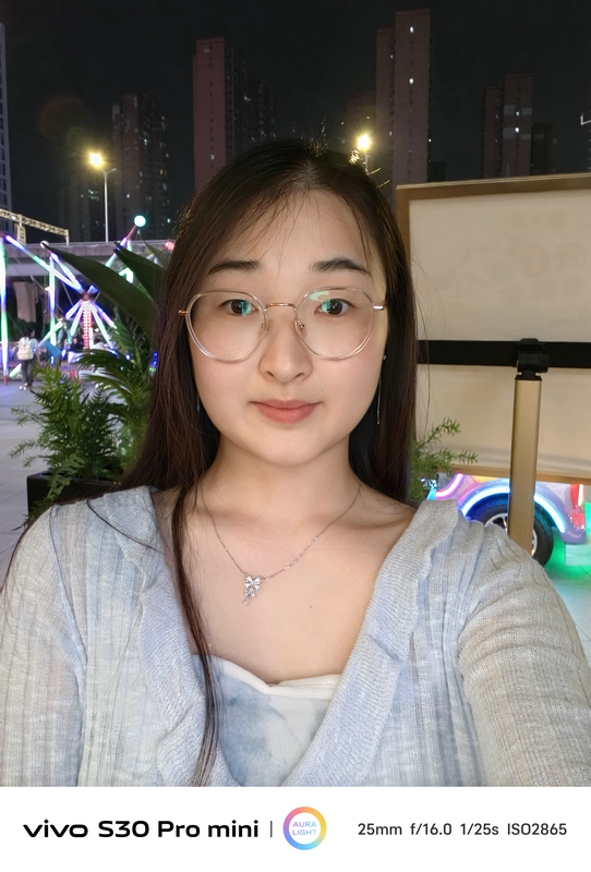 而在暗光场景,得益于该机配备的2颗影棚级立体柔光灯,搭配AI 3D影棚光矫正,可以合力实现影棚级立体补光,并支持调节色温,直接提高了夜景自拍的质量。在实际拍摄中,开启前置双柔光灯后,夜间自拍的拍摄效果得到了显著提升,使面部光影更立体、更自然,让夜间自拍也能轻松拍出令人满意的照片。