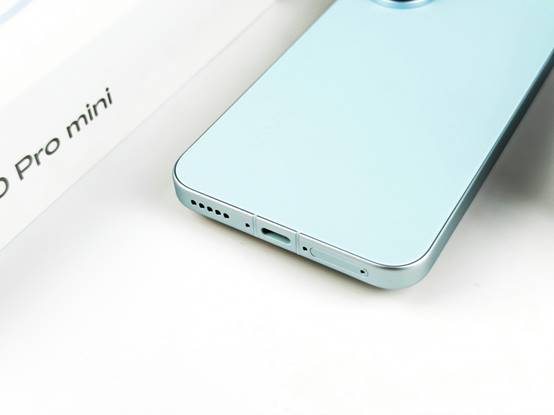 机身背部是vivo S30 Pro mini的颜值亮点之一。它采用了全新的多彩配色方案,包括酷莓粉、柠檬黄、薄荷青和可可黑等,每一种配色都蕴含着独特的情感表达与时尚态度。笔者此次拿到的是其中的薄荷青配色版本,其灵感取自晨雾中新舒展的薄荷嫩芽,纯净、安静且略带梦幻气息,如同时尚圈中的一股清流,清新脱俗。同时背面的冰感玻璃工艺更是别具匠心,通过药水配方调整,使玻璃表面生长出层层堆叠的球状晶体,视觉上清爽干净,触感上丝滑微凉,不仅在炎炎夏日带来清凉之感,更在日常使用中彰显高级质感。