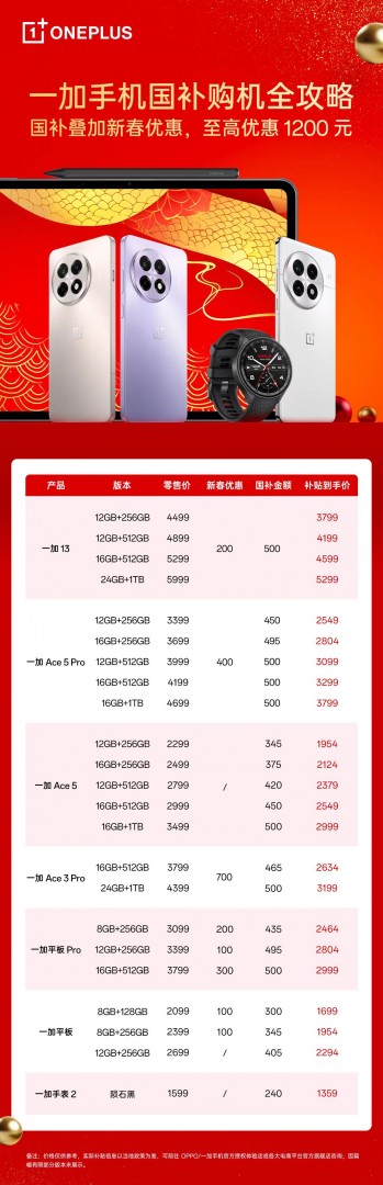 一加 Ace 5 Pro 以及一加 13 等众多一加人气产品在 OPPO 商城、天猫、京东、授权门店等平台持续热销,专属限时新春优惠叠加国补,性能更强,价格更香。