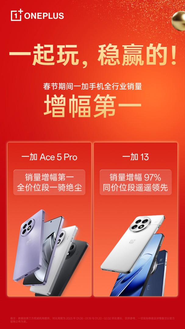 【TechWeb】2 月 12 日,一加官方宣布,春节期间一加手机销量增幅全行业第一,其中年度游戏体验天花板一加 Ace 5 Pro 销量增幅全价位段单品第一,样样超 Pro 的一加 13 销量增幅 97%,同价位段遥遥领先。