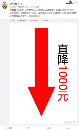 近日,苏宁手机官微宣布,3月7日起对苏宁易购和苏宁天猫店在售的iPhoneXS进行调价,最高降价1000元,用以配合”女王节”活动。