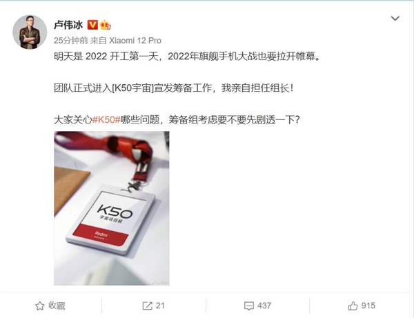 据小米集团中国区总裁、Redmi品牌总经理卢伟冰最新发布的信息显示,Redmi团队正式进入K50宇宙宣发筹备工作,2022年旗舰手机大战即将拉开帷幕,并且他将亲自担任组长,这也充分说明小米高层对Redmi K50旗舰款机型的重视。结合此前爆料,Redmi K50系列首批搭载联发科天玑9000旗舰处理器,代号为“matisse”,这款新机可能是Redmi K50电竞版。